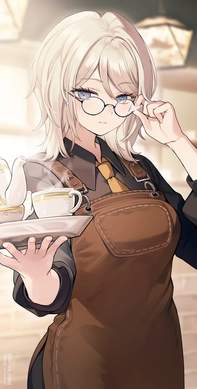 1girladjusting_eyewearapronbaristablack-framed_eyewearblack_shirtblue_eyesbrown_apronclosed_mouthcollared_shirtcupglassesholdingholding_trayindoorslong_sleeveslooking_at_viewermedium_hairnecktieround_eyewearseven_association_south_uniformshirtsolostandingsteamteacupteapottraywhite_hairwing_collaryellow_necktie