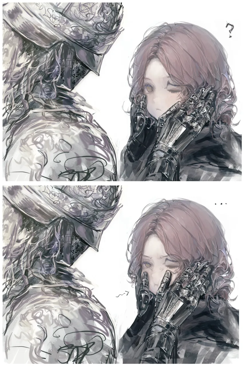 ...1girl1other2koma:i;i?ambiguous_genderannoyedarmorbrown_eyesbrown_haircheek_squashcomiccovered_facefacial_markfrom_sidefull_armorgauntletshands_on_another's_cheekshands_on_another's_facehelmhelmetlooking_at_anotherone_eye_closedpauldronsportraitshort_hairshoulder_armorsimple_backgroundwavy_hairwhite_background