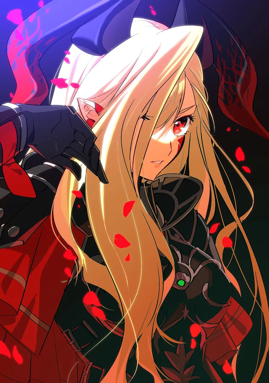 1girlarmorblack_backgroundblonde_hairbreastplatecapehair_over_one_eyehornslong_hairlooking_at_viewerpetalspointy_earsred_eyesrose_petalssoloupper_body