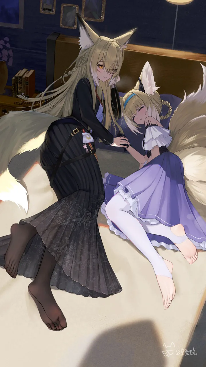 2girlsanimal_ear_fluffanimal_earsblack_glovesblack_jacketblack_pantyhoseblack_skirtblonde_hairblue_hairbandbookbraidclosed_mouthfeetfox_earsfox_girlfox_tailfull_bodygloveshairbandindoorsjacketlong_hairlong_skirtlooking_at_viewermother_and_daughtermulticolored_hairmultiple_girlson_bedorange_eyespantyhosescarscar_on_facesingle_gloveskirtsleepingsmiletailwhite_hairwhite_pantyhose