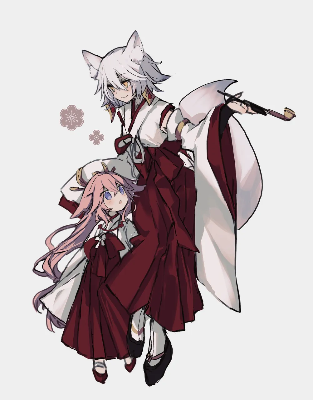 2girls:oaged_downanimal_ear_fluffanimal_earschildclosed_mouthdetached_sleevesearringsfox_earsfox_girlfox_tailfull_bodyhakamahakama_skirtholdingholding_smoking_pipejapanese_clothesjewelrykimonokiserulong_hairlong_sleeveslooking_to_the_sidemikomultiple_girlsokobopink_hairplatform_sandalspurple_eyesred_hakamared_skirtsandalsshort_hairskirtsmilesmoking_pipesockstabitailwhite_hairwhite_kimonowhite_sockswide_sleevesyellow_eyes