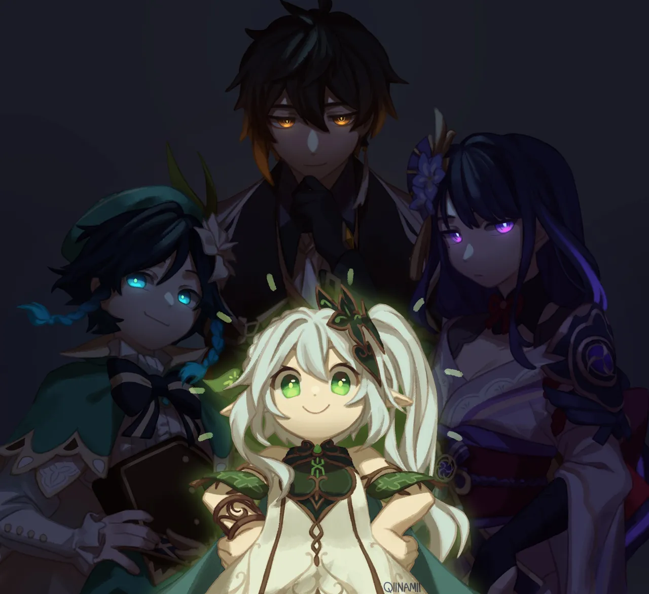 2boys2girlsberetblack_glovesblack_hairblue_eyesblue_hairbraidbreastsbrown_haircapecleavagecollared_capecorsetdressearringsformal_clothesfrilled_sleevesfrillsgenshin_impactglovesglowingglowing_eyesgradient_hairgreen_capegreen_eyesgreen_headwearhand_on_own_hiphands_on_own_hipshatjapanese_clothesjewelrykimonolong_hairlooking_at_viewermulticolored_hairmultiple_boysmultiple_girlsnahida__genshin_impactorange_hairpurple_eyespurple_hairqiinamiiraiden_shogunshort_kimonoside_braidsside_ponytailsingle_earringsleevelesssleeveless_dresssmilesuittasseltassel_earringstwin_braidsventi__genshin_impactwhite_dresswhite_hairzhongli__genshin_impact