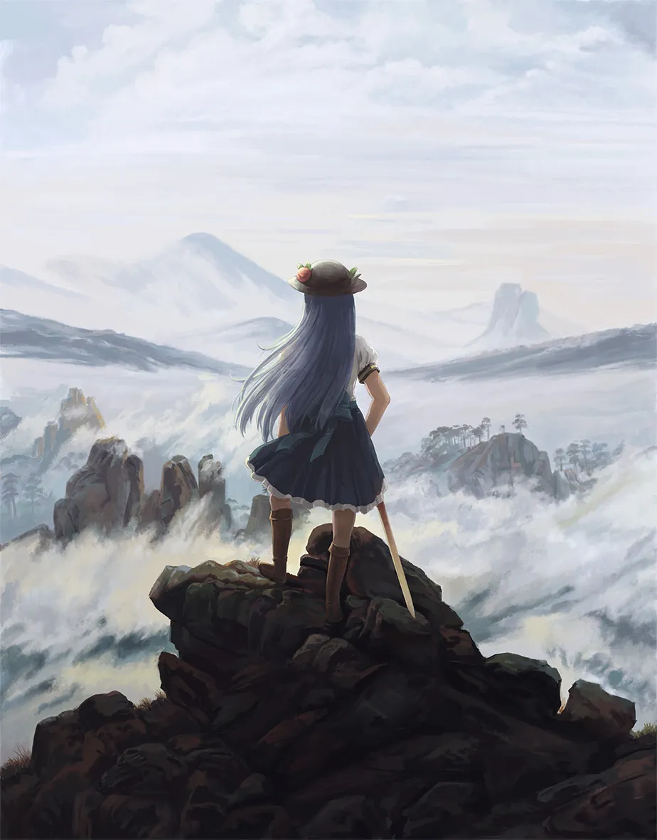 1girlabove_cloudsblue_hairbootscloudcloudy_skydaydressfaux_traditional_mediafine_art_parodyfloating_hairfoodfrom_behindfruitfull_bodyhatknee_bootslayered_dressleaflong_hairmountainoutdoorsparodypeachshort_sleevesskysolostandingsword_of_hisouvery_long_hairwind