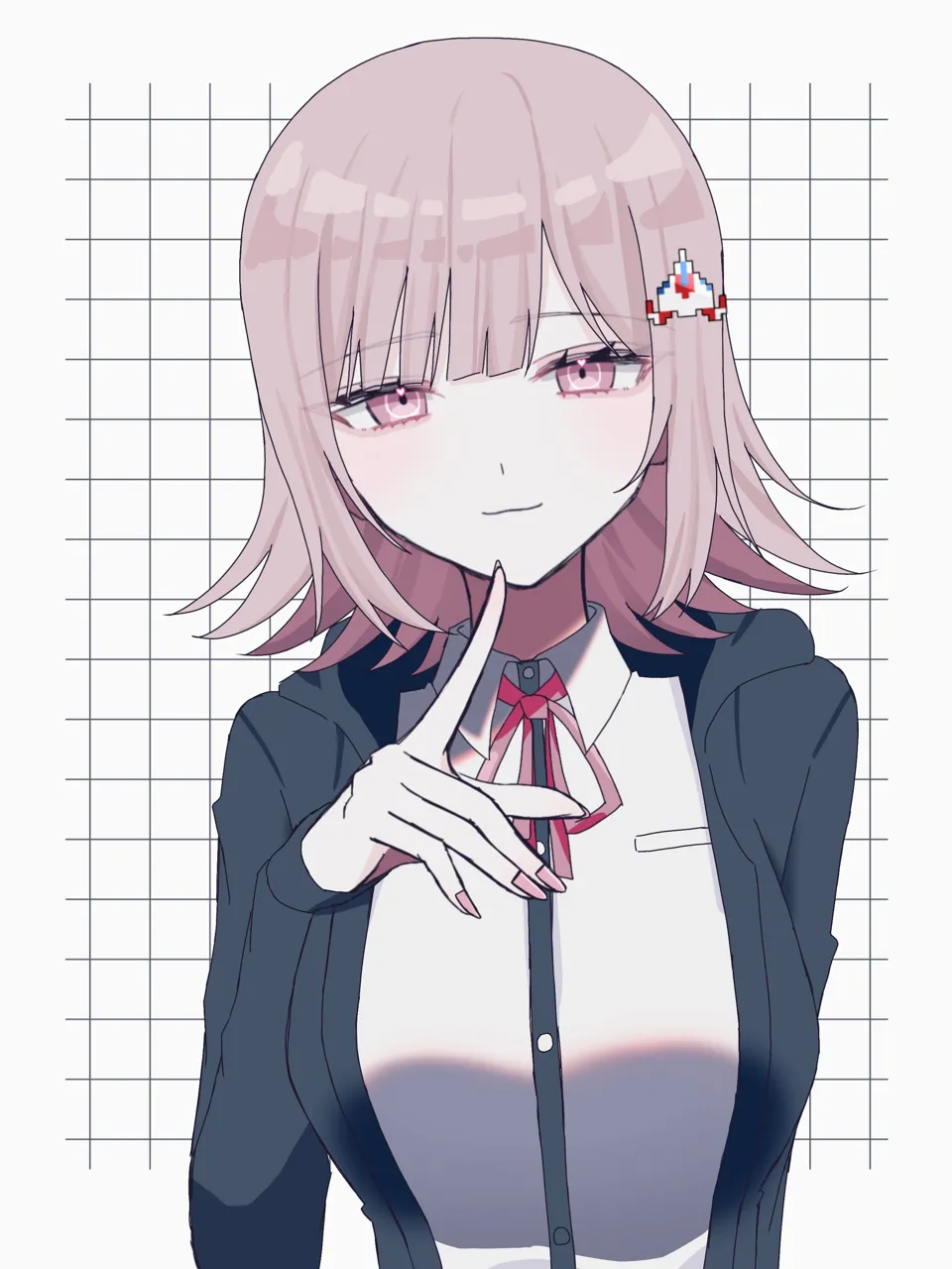 1girlblack_jacketblack_shirtbreast_pocketbreastsbrown_hairclosed_mouthcollared_shirtdress_shirthair_ornamenthand_upjacketlarge_breastslong_sleevesmedium_hairnail_polishneck_ribbonopen_clothesopen_jacketpink_eyespink_nailspink_ribbonpocketribbonshirtsmilesolotwo_tone_shirtwhite_backgroundwhite_shirt