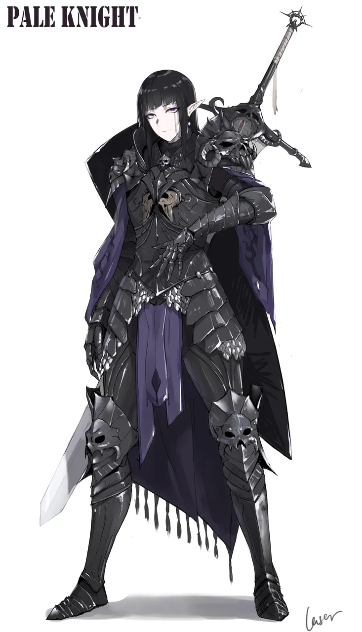 1girlandrogynousarmorblack_armorblack_haircapecharacter_nameearringselffantasyfauldsfull_bodygauntletsgreaveshime_cuthuge_weaponjewelrypale_skinpelvic_curtainpointy_earspurple_eyesreverse_trapshieldsimple_backgroundsolostandingswordweaponweapon_on_backwhite_background