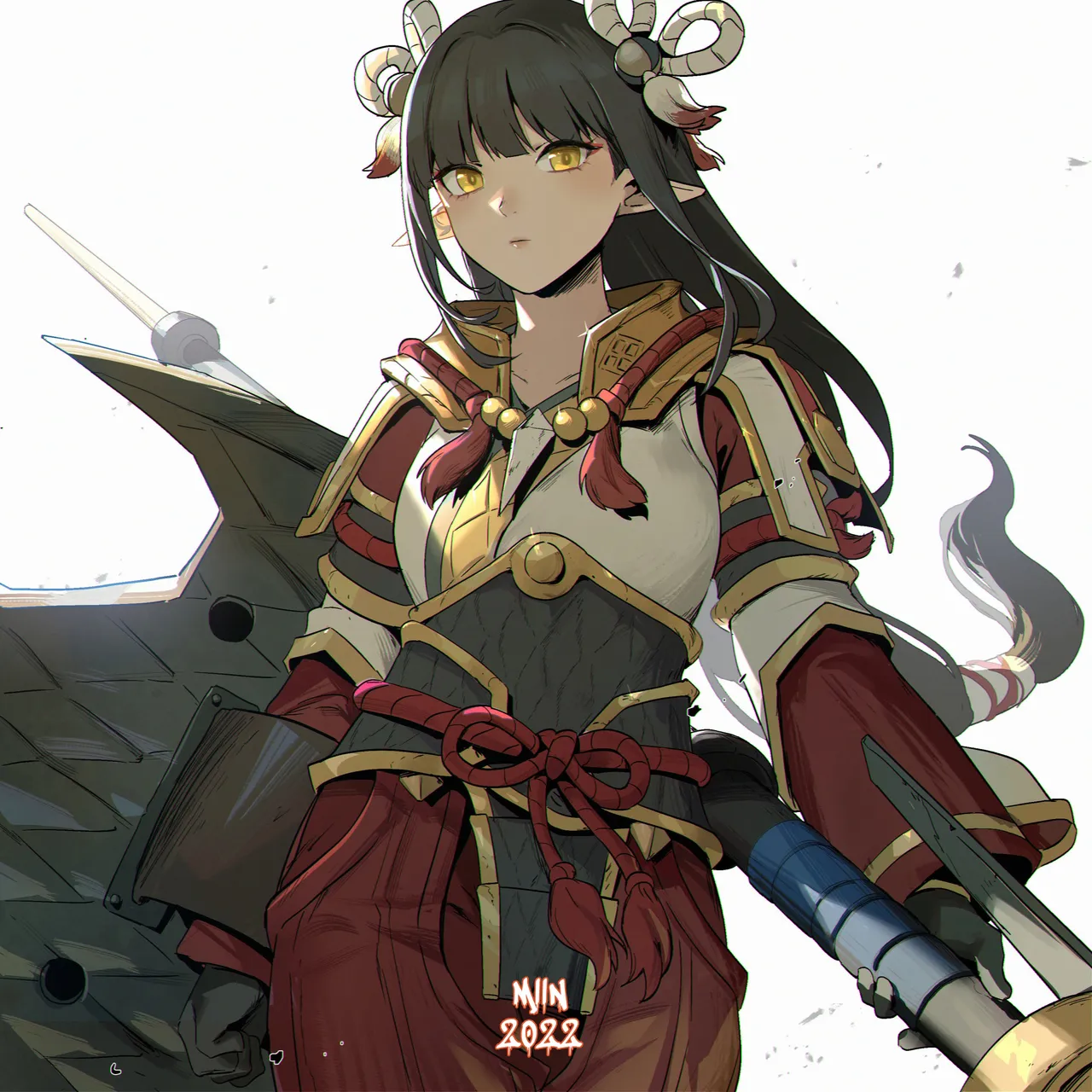 1girlarmorartist_nameblack_glovesblack_hairbreastsclosed_mouthcowboy_shotdatedexpressionlesseyeshadowglovesgold_trimhair_ornamenthakamaholdingholding_weaponjapanese_clothesjewelrykimonolong_hairlooking_at_viewerlow-tied_long_hairmakeupmedium_breastsnecklacepointy_earsred_eyeshadowred_hakamared_skirtroperope_beltshieldsidelockssimple_backgroundskirtsolostandingtasselweaponwhite_backgroundwhite_kimonoyellow_eyes