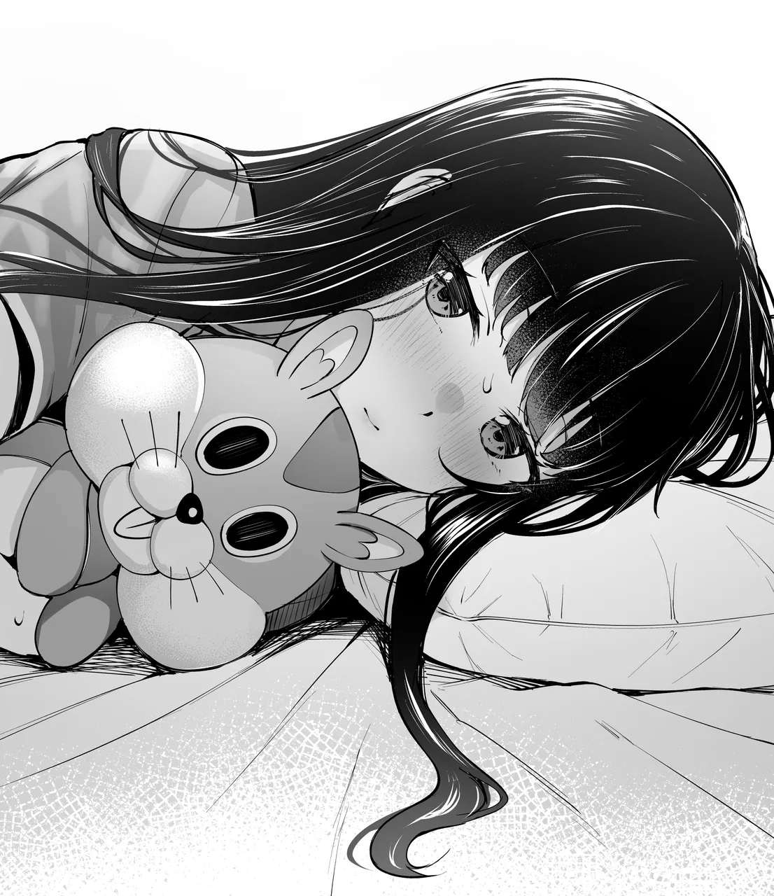 1girlblushclosed_mouthfull-face_blushgreyscalehair_spread_outhead_on_pillowholdingholding_stuffed_toyimplied_yurilong_hairlooking_at_viewerlyingmonochromeon_sidepillowpovsimple_backgroundsolostuffed_toysweatdropwhite_background