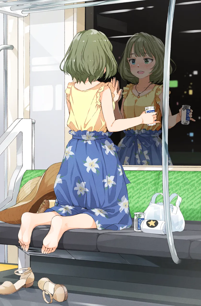 1girlalcoholbagbarefootbeer_canblue_skirtblushbob_cutcandrink_candrunkfacing_awayfeetfloral_printfrilled_sleevesfrillsfrom_behindgreen_hairgrocery_baghandbaghatjewelrykneelinglong_skirtlooking_afarlooking_outsidemedium_hairnecklacenightnose_blushone_cuppinky_outplastic_bagreflectionsakeshirtshirt_tucked_inshoesshopping_bagsingle_serve_sakeskirtsleevelesssleeveless_shirtsmilesolessolostraw_hattoestrain_interiorunworn_hatunworn_headwearunworn_shoeswindowyellow_shirt