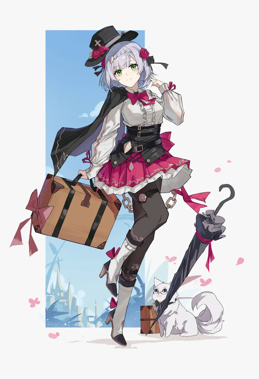 1girlalternate_costumeanimalbeltblack_bowblack_capeblack_hatblack_pantyhosebootsbowbraidbreastscapecatflowerfull_bodygreen_eyesgrey_hairhathigh_heelsleg_uplong_sleevesmedium_breastspantyhosepink_skirtpleated_skirtred_flowerred_ribbonribbonshirtshort_hairsimple_backgroundskirtsolostandingstanding_on_one_legsuitcasethigh_strapumbrellawhite_bootswhite_shirt