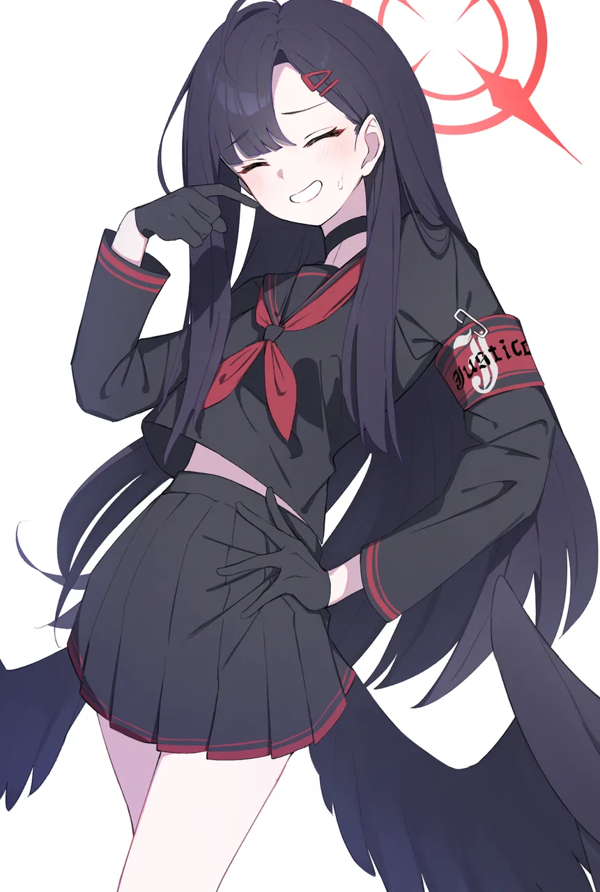 1girlarmbandblack_chokerblack_glovesblack_hairblack_serafukublack_skirtblack_wingsblushchokerclosed_eyesclothes_writingcowboy_shotenglish_textfacing_viewerglovesgrinhair_ornamenthaircliphalohand_on_own_hiphand_upindex_finger_raisedlong_hairlong_sleeveslow_wingsmidriffneckerchiefpleated_skirtred_neckerchiefsafety_pinschool_uniformserafukusimple_backgroundskirtsmilesolosweatdropswept_bangsthighswhite_backgroundwings