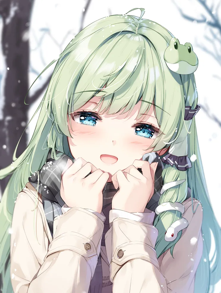 1girladjusting_scarfalternate_costumeblack_scarfblue_eyesblushfrog_hair_ornamentgreen_hairhair_ornamenthair_tubeshands_upjacketlong_hairlong_sleevesopen_mouthoutdoorsplaid_clothesplaid_scarfscarfsingle_hair_tubesmilesnake_hair_ornamentsnowingsolotreeupper_bodywinteryellow_jacket