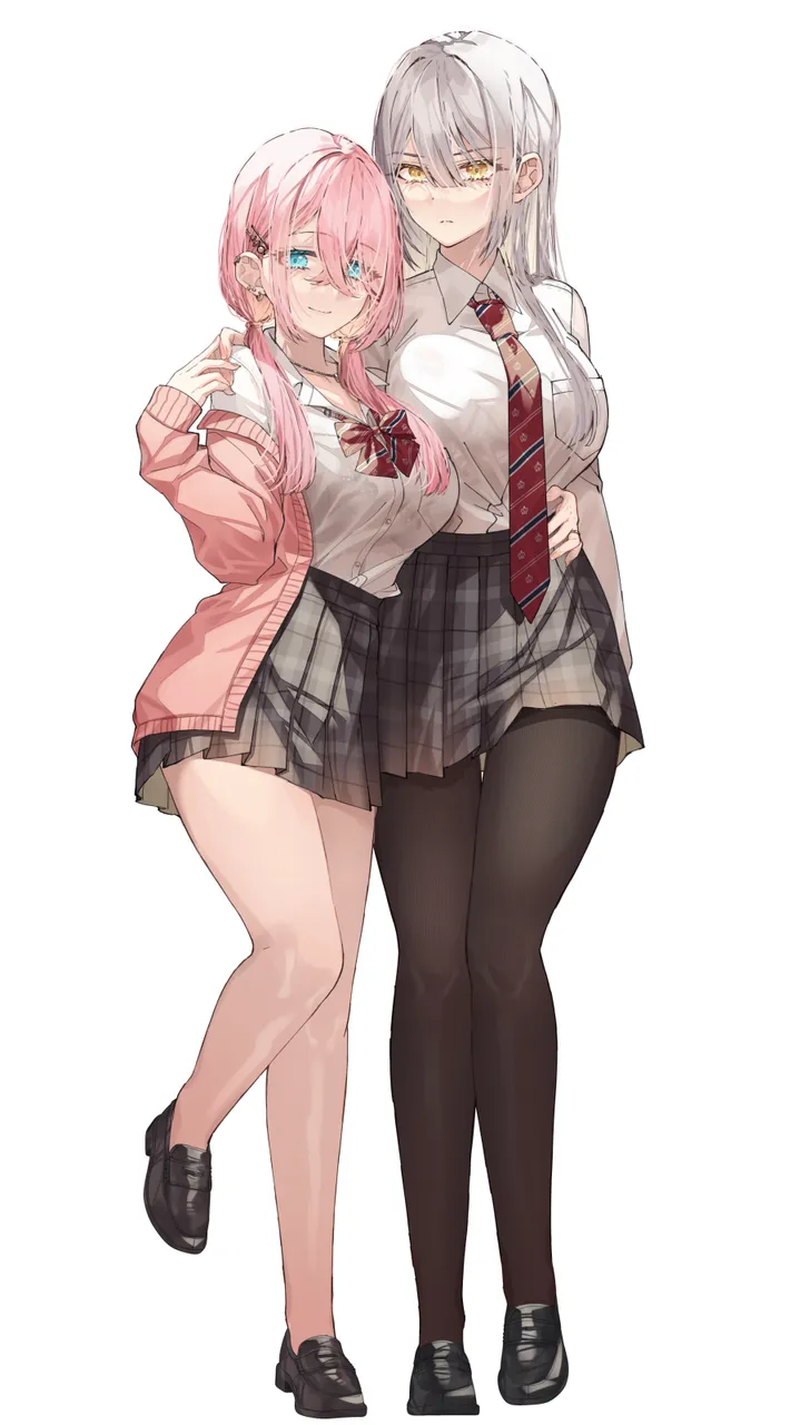 2girlsarm_around_waistblue_eyesbreastscouplegrey_hairhand_on_another's_waistheight_differencehuglarge_breastslong_hairlow_twintailsmultiple_girlspantyhosepink_hairpleated_skirtsimple_backgroundskirtsmiletwintailsuniformyellow_eyesyuri