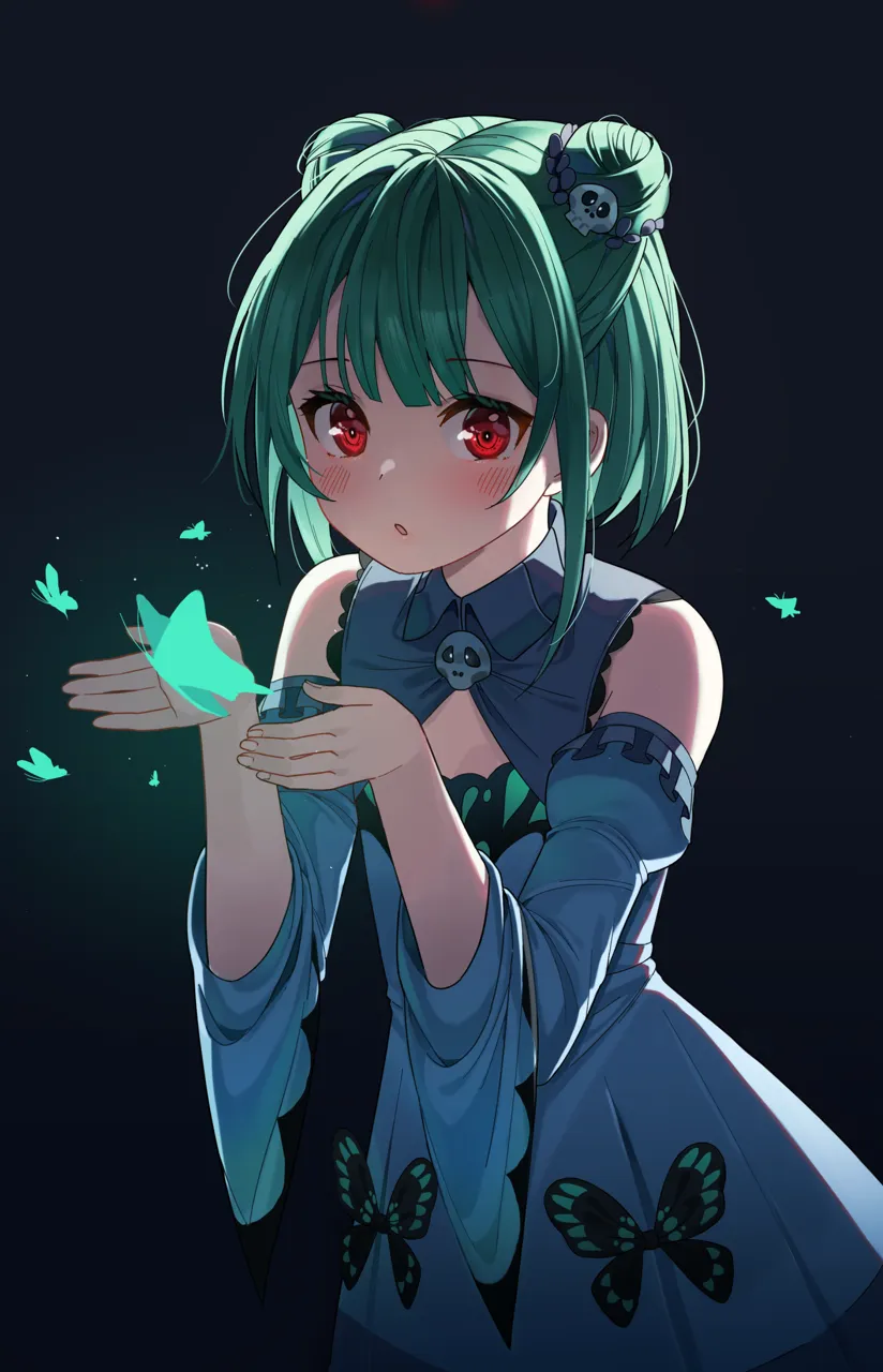 1girlanimal_printbare_shouldersblue_dressblue_sleevesblushbowbroochbugbutterflybutterfly_printdetached_collardetached_sleevesdouble_bundressdress_bowearringsflat_chestfrilled_dressfrillsgreen_hairhair_bunhair_ornamenthands_upjewelryjuliet_sleeveslong_sleeveslooking_at_viewerparted_hairparted_lipspuffy_sleevesred_eyesshort_dressshort_hairsidelocksskull_earringsskull_hair_ornamentsolostraplessstrapless_dressvirtual_youtuberwide_sleeves
