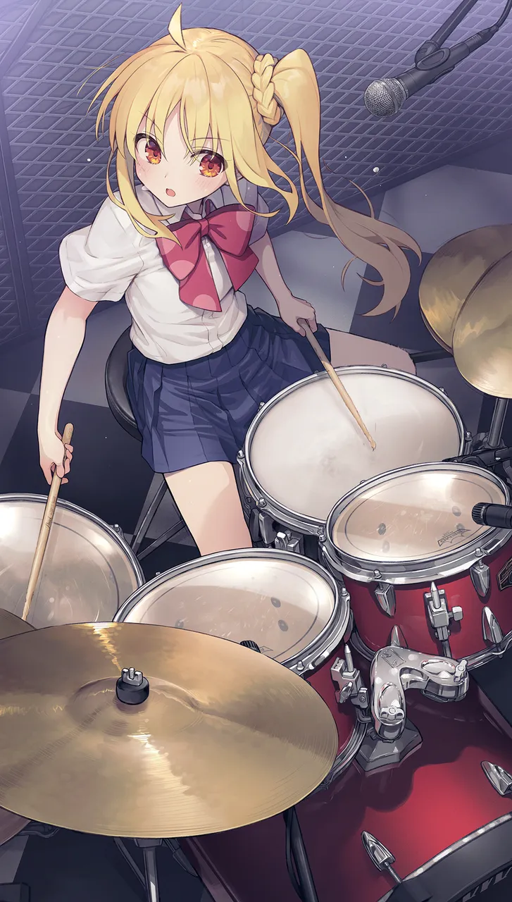 1girlahogeblonde_hairblue_skirtblushbowbowtiecheckered_floorcollared_shirtcymbalsdrumdrum_setdrumsticksfrom_abovehair_ornamenthair_scrunchieholdingholding_drumsticksinstrumentlong_hairmicrophoneminiskirtmusicopen_mouthparted_bangsplaying_instrumentpleated_skirtred_bowred_bowtiered_eyesschool_uniformscrunchieshimokitazawa_high_school_uniformshirtshirt_tucked_inshort_sleevesside_ponytailsidelockssittingskirtsolothighswhite_shirtyellow_scrunchie