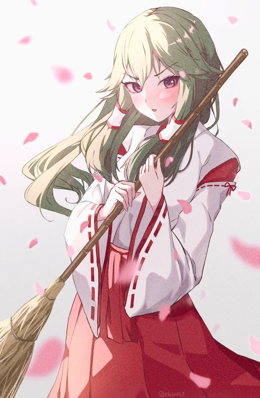 1girlblurryblushbroomdetached_sleevesembarrassedgreen_hairhair_tubeshakamaholdingholding_broomjapanese_clotheskimonolong_hairlooking_at_viewermikooutdoorsparted_lipspetalsribbon-trimmed_sleevesribbon_trimsolowhite_kimonowide_sleeves