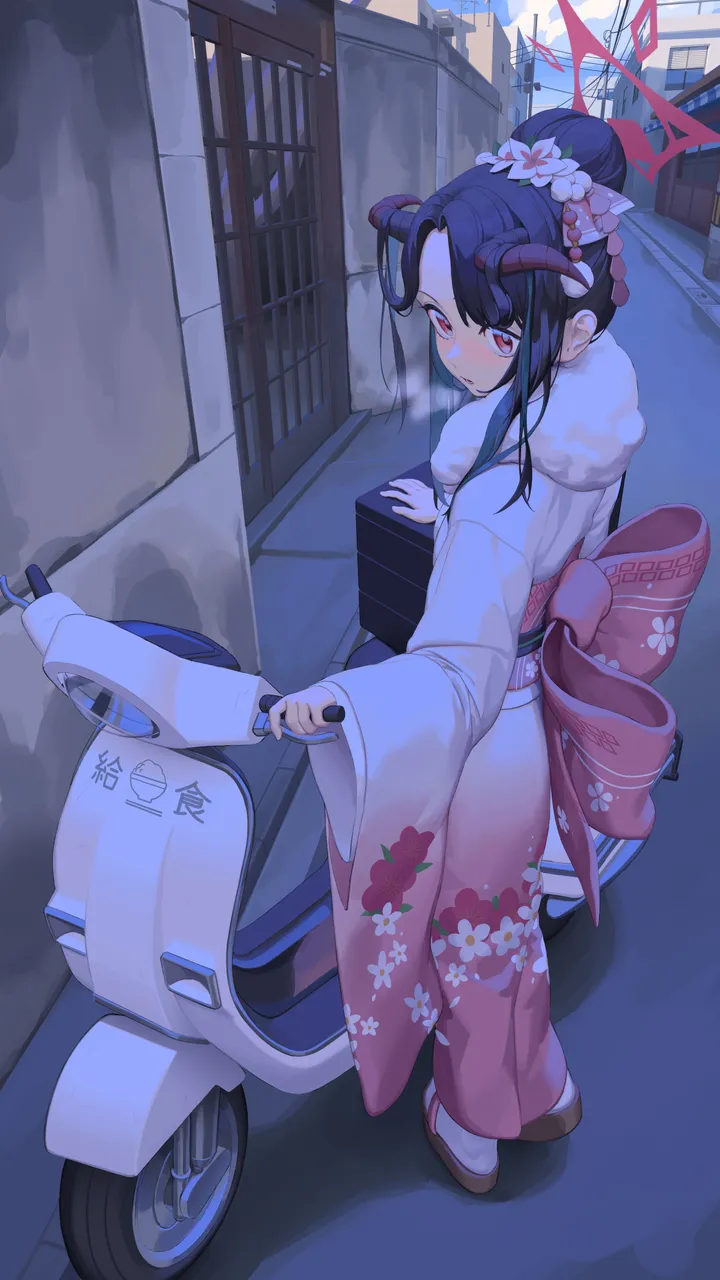 1girlblack_hairfloral_printflowerfull_bodyfur_collarhair_bunhair_flowerhair_hornshair_on_hornhair_ornamenthalohornsjapanese_clotheskimonolong_hairlong_sleeveslooking_to_the_sidemotor_vehicleobiofficial_alternate_costumeopen_mouthoutdoorspink_kimonoprint_kimonored_eyessandalssashscootersingle_hair_bunsockssolostandingwhite_kimonowhite_sockswide_sleeveszouri
