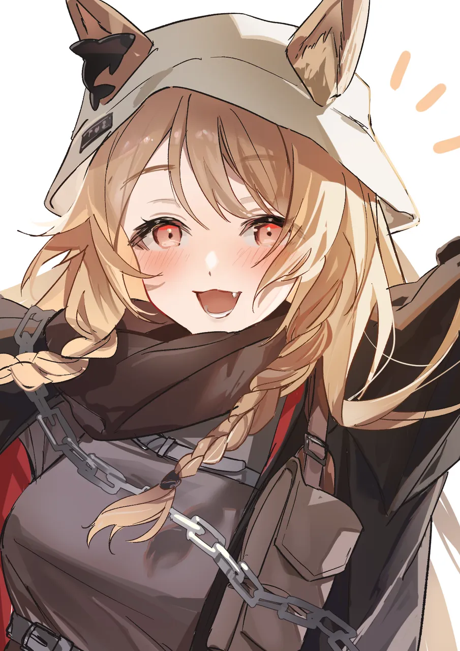 1girl:danimal_earsblack_jacketblack_scarfblushbraidbreastsbrown_hairchaindog_earsears_through_headwearfanggrey_shirtjacketlarge_breastslong_hairlooking_at_viewerofficial_alternate_costumeopen_clothesopen_jacketopen_mouthred_eyesscarfshirtsimple_backgroundsmilesolotwin_braidsupper_bodywhite_background