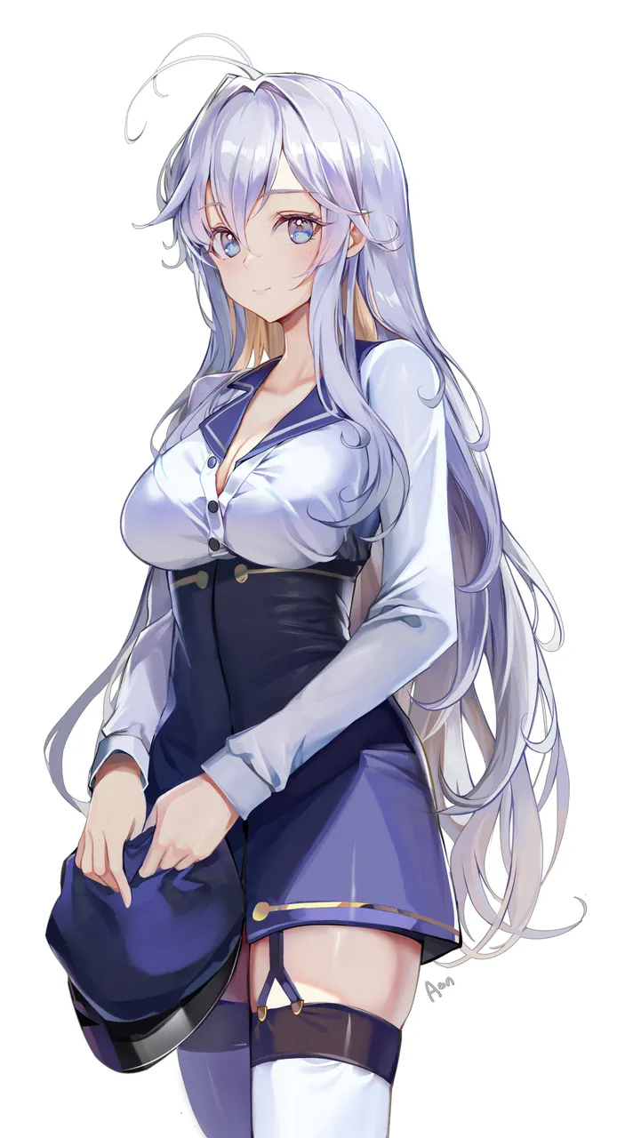 1girlblue_eyesbreastsgrey_eyesgrey_hairhathigh-waist_skirtholdingholding_unworn_clothesholding_unworn_hatlarge_breastslong_hairlong_sleeveslooking_at_viewerpartially_unbuttonedshirtsimple_backgroundskirtsmilesolothighhighsunworn_hatunworn_headwearvery_long_hairwhite_backgroundwhite_hairzettai_ryouiki