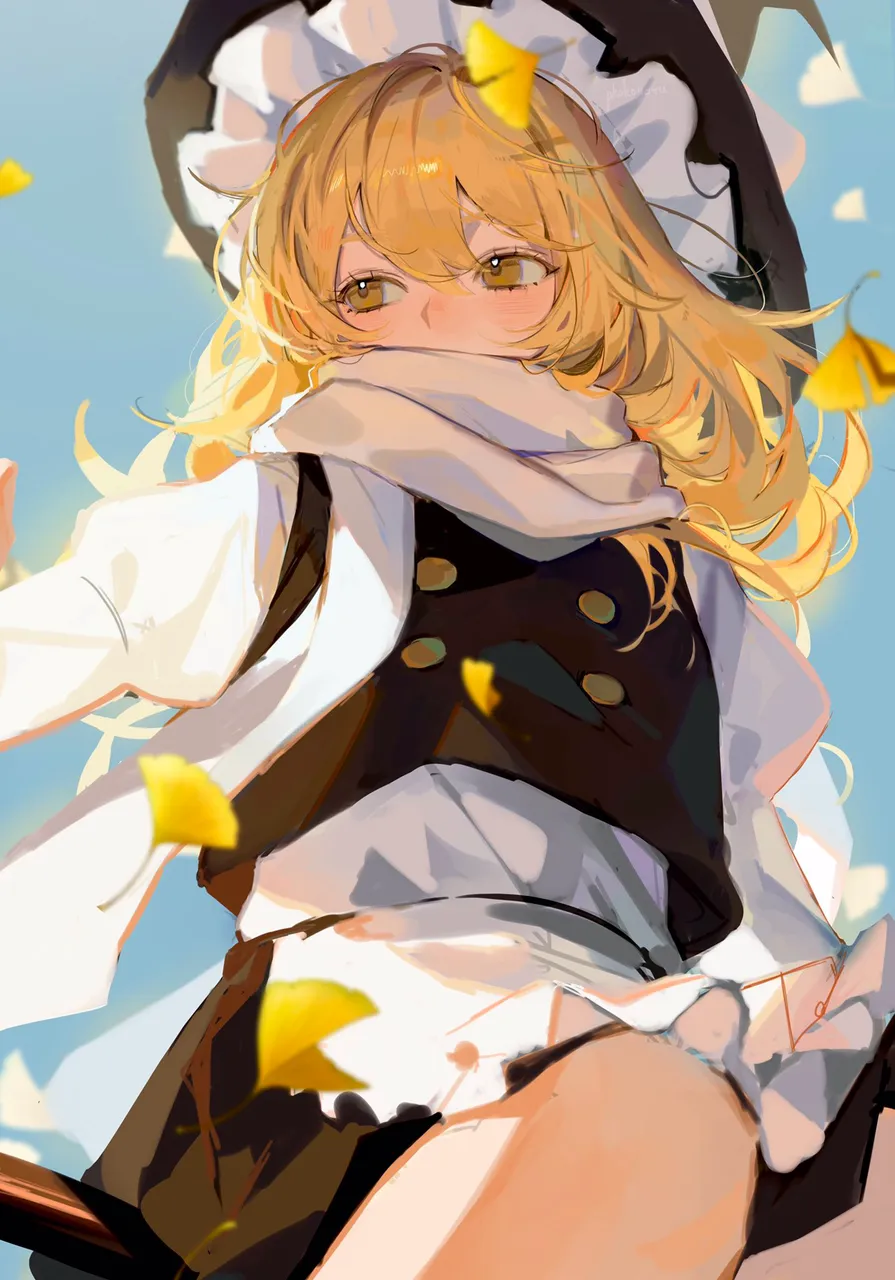 1girladapted_costumeapronblack_hatblack_skirtblack_vestblonde_hairblushbuttonscovered_mouthginkgo_leafhatjuliet_sleevesleaflong_hairlong_sleeveslooking_awaypuffy_sleevesscarfshirtsittingskirtsmilesolovestwaist_apronwhite_scarfwhite_shirtwitch_hatyellow_eyes