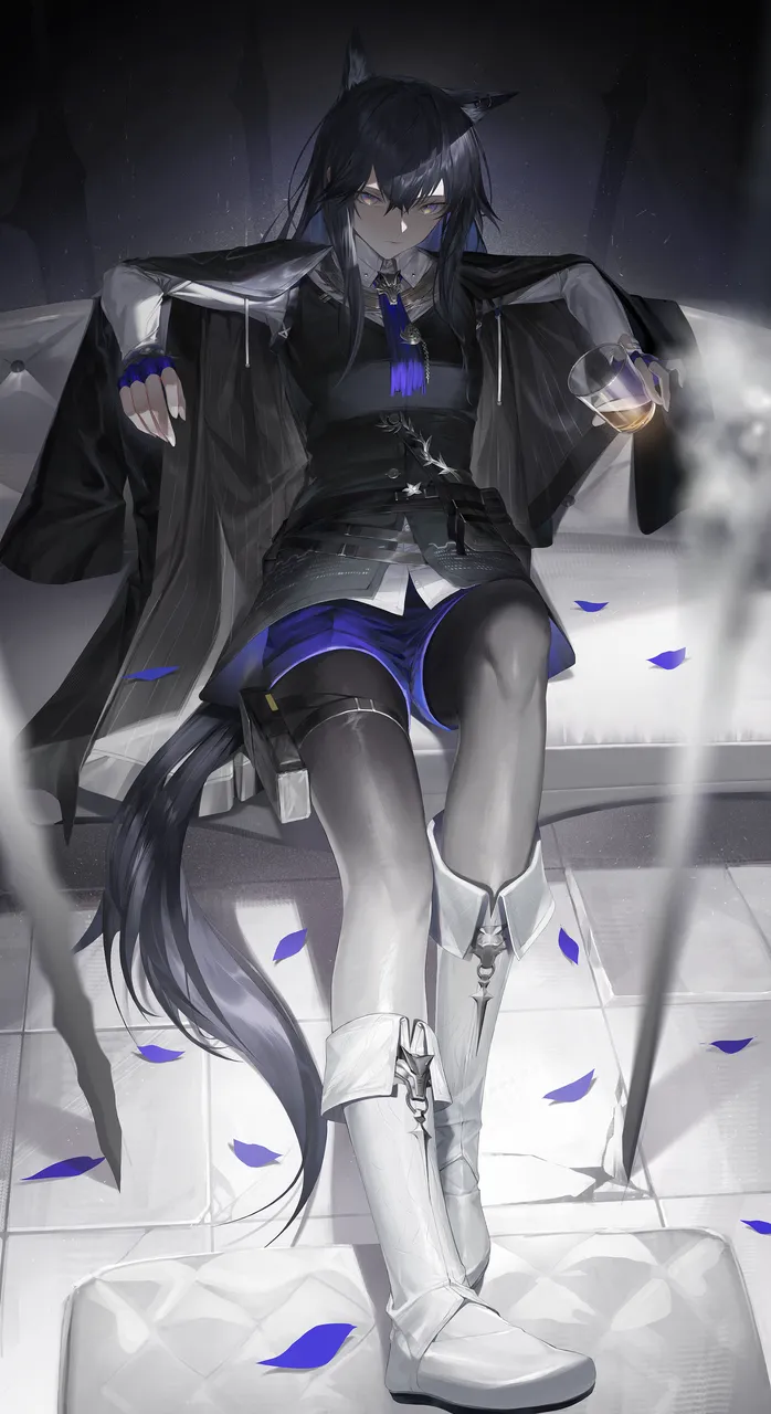 1girlanimal_ear_fluffanimal_earsblack_capeblack_coatblack_hairblack_pantyhoseblack_vestblue_glovesblue_necktieblue_shortsbootscapecoatcoat_on_shoulderscouchcupdouble-parted_bangsfingerless_glovesfull_bodyglovesgradient_eyesholdingholding_cupholsterlong_hairlong_sleeveslooking_at_viewermulticolored_eyesnecktieon_couchpantyhosepantyhose_under_shortsshortssidelockssittingsoloswordtailthigh_holstervestweaponwhite_bootswolf_earswolf_girlwolf_tail
