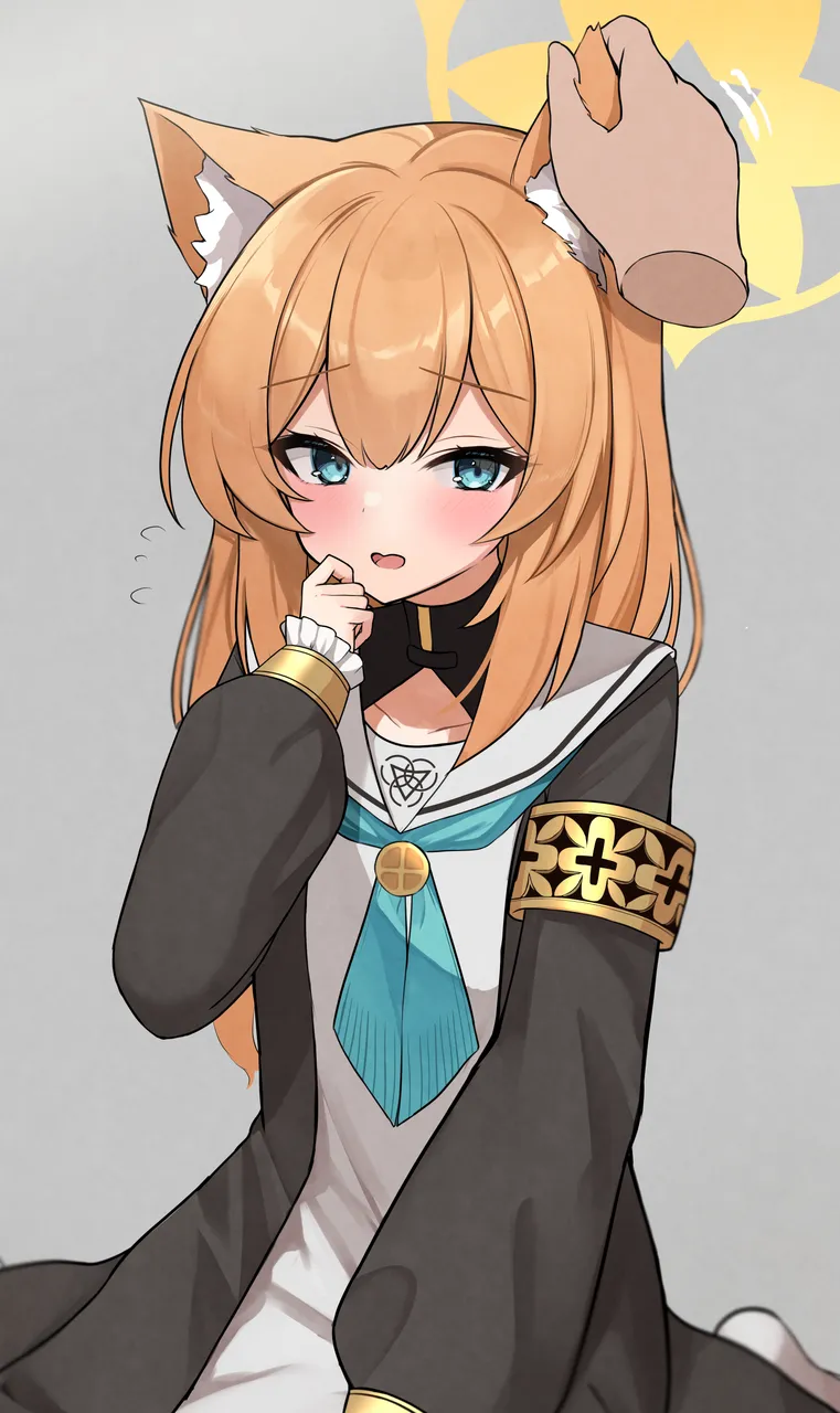 1boy1girlanimal_ear_fluffanimal_earsblack_dressblue_eyesblushbrown_hairdisembodied_handdressear_fondlingflying_sweatdropsfrilled_sleevesfrillsgrey_backgroundhair_between_eyeshalohand_uplong_sleevesopen_mouthpuffy_long_sleevespuffy_sleevessailor_collarsimple_backgroundsleeves_past_wristssolo_focuswhite_sailor_collaryellow_halo