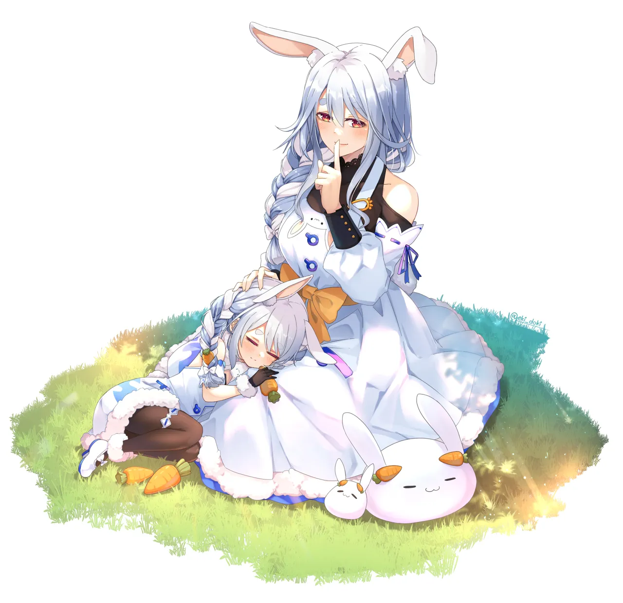 2girlsaged_downanimal_ear_fluffanimal_earsapronbare_shouldersblack_glovesblack_shirtblack_thighhighsblue_hairblushbowbraidcarrot_hair_ornamentclosed_eyesdetached_sleevesdressextra_earsfinger_to_mouthfood_themed_hair_ornamentfur_trimmed_dressfur_trimmed_footwearfur_trimmed_glovesfur_trimglovesgrasshair_ornamenthand_on_another_s_headlap_pillowlong_hairmary_janesmature_femalemother_and_daughtermulticolored_hairmultiple_girlsoff_shoulderpantyhosepuffy_sleevesrabbitrabbit_earsrabbit_girlred_eyesribbonshirtshoessidelockssignaturesimple_backgroundsingle_braidsleepingsmilethighhighstwin_braidstwo_tone_hairvirtual_youtuberwhite_backgroundwhite_dresswhite_footwearwhite_hairyellow_bowyellow_ribbon