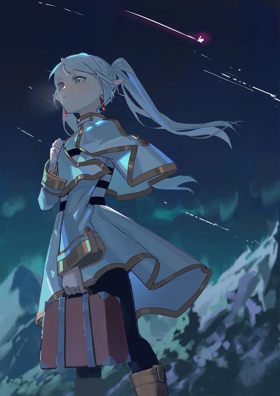 1girlblack_pantyhosebootsbrown_bootscapeletearringselffloating_earringsgold_trimgreen_eyeshand_upholdingholding_suitcasejewelrylong_hairlong_sleevesnightoutdoorspantyhosepointy_earsshirtshooting_starskirtsolostandingstriped_clothesstriped_shirtsuitcasetwintailswhite_capeletwhite_hairwhite_skirtwind
