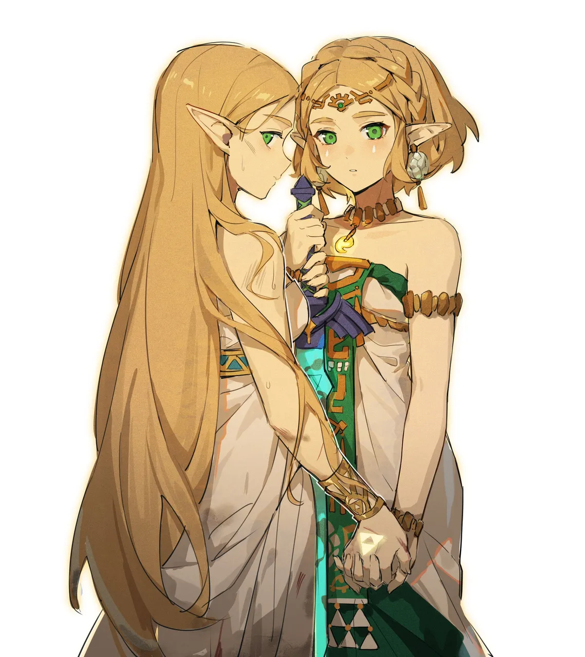 2girlsbare_shouldersblonde_hairbraceletbraidbreastscrown_braiddressearringsfacial_markgreen_eyeshair_ornamenthairclipholdingholding_handsholding_weaponinterlocked_fingersjewelrylong_hairlooking_at_viewermultiple_girlsofficial_alternate_costumeofficial_alternate_hair_lengthofficial_alternate_hairstyleparted_bangspointy_earsshort_hairsidelockssimple_backgroundsmall_breastsstandingteardrop_facial_marktime_paradoxvery_long_hairweaponwhite_backgroundwhite_dress