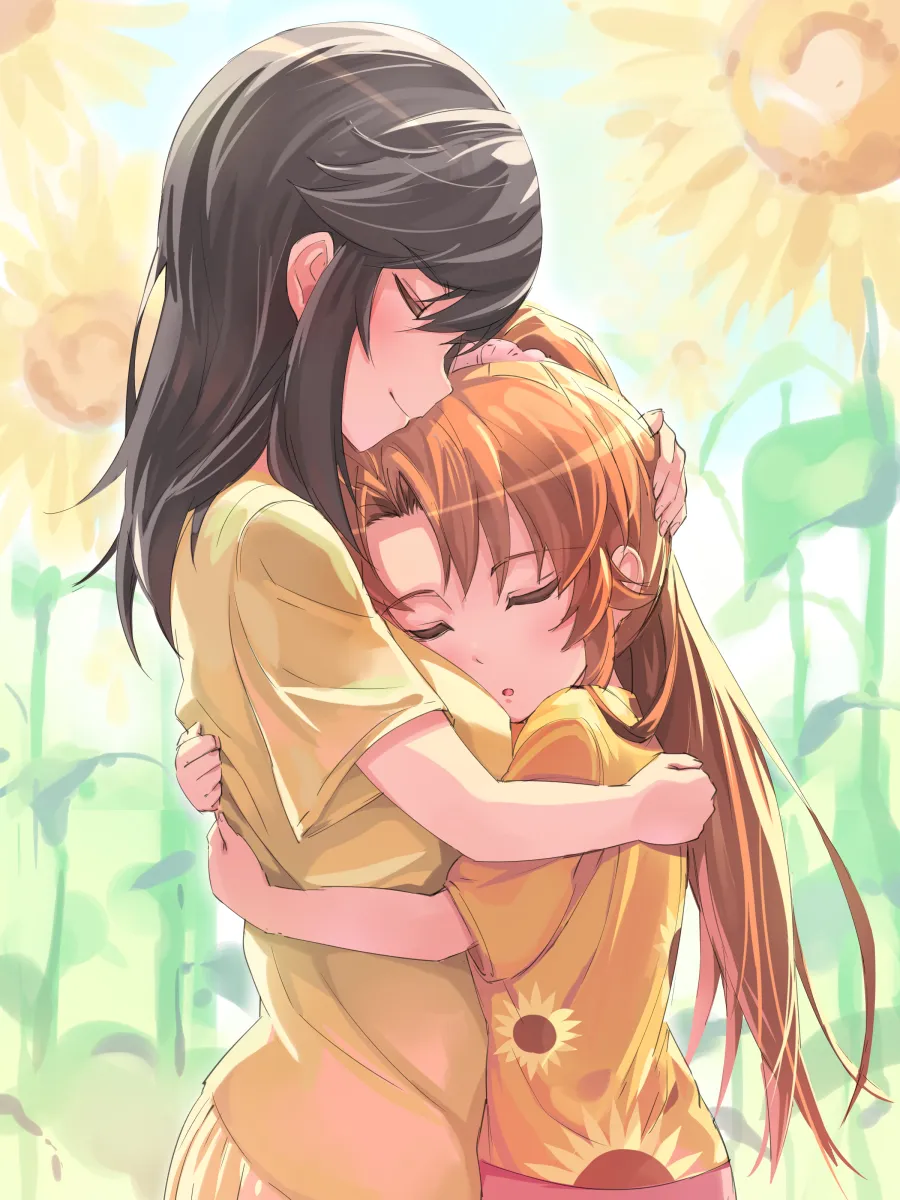 2girlsblack_hairbrown_hairclosed_eyescouplecuddlingfieldflowerflower_fieldfrom_sidehand_on_another's_headheight_differencehuglong_hairmultiple_girlsmutual_hugoutdoorsponytailshort_sleevessmilesunflowersunflower_fieldyuri
