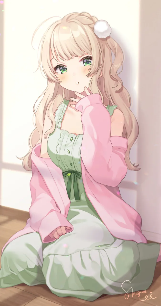 1girlagainst_wallahogeartist_nameblunt_bangsblushbowbraidbrown_haircardigancenter_frillscollarbonecurly_hairdressempire_waisteyebrows_hidden_by_hairfeet_out_of_framefrilled_strapsfrillsgreen_bowgreen_dressgreen_eyeshair_ornamenthand_on_laphand_on_own_chinindoorslens_flarelong_dresslong_hairlong_sleeveslooking_at_vieweroff_shoulderofficial_alternate_costumeofficial_alternate_hair_lengthofficial_alternate_hairstyleon_floorparted_lipspink_cardiganpom_pom_(clothes)pom_pom_hair_ornamentside_braidside_partsidelockssignaturesingle_braidsittingsleeves_past_wristssolovirtual_youtuberwavy_hairwindow_shadowwooden_flooryokozuwari
