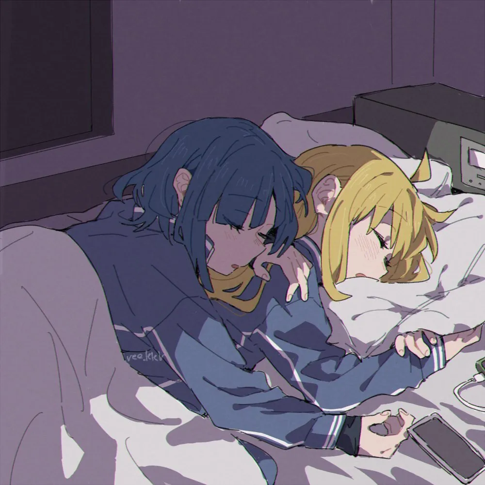 2girlsahogebedroomblanketblonde_hairblue_haircellphoneclosed_eyescuddlinggirl_on_topindoorslying_on_personmultiple_girlspajamasphoneshared_bedsignaturesleepingsleeping_on_personsmartphoneunder_coversupper_bodyyuri