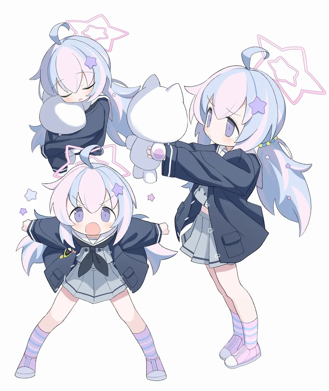 1girlahogebeadsblack_neckerchiefblue_eyesblue_hairclosed_eyesgrey_jacketgrey_serafukugrey_skirthair_beadshair_ornamenthair_scrunchiehaloholdingholding_stuffed_toyhugjacketkneehighsleaning_forwardlow_twintailsmulticolored_hairmulticolored_socksmultiple_viewsneckerchiefpink_hairpink_shoespleated_skirtpurple_eyespurple_hairsailor_collarschool_uniformscrunchieserafukushoessimple_backgroundskirtsneakerssocksstandingstar_(symbol)star_hair_ornamentstar_halostreaked_hairstriped_clothesstriped_socksstuffed_toytwintailstwo-tone_hairwhite_backgroundwhite_sailor_collar