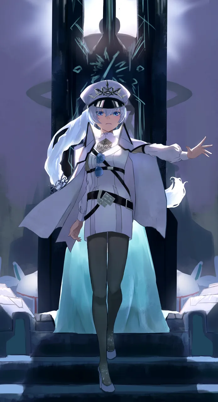 1girlarm_at_sidebeltblue_eyesclosed_mouthdresseyewear_hangfloating_hairfull_bodygrey_pantyhosehathigh_heelslong_hairlong_sleevesmilitarymilitary_hatmilitary_uniformmultiple_beltsofficial_alternate_costumeopen_handoutstretched_armpantyhosepeaked_capponytailpurple_lipssittingsitting_on_thronesnowflake_printsolostairsstandingsunglassesthroneunworn_eyewearwhite_dresswhite_hair
