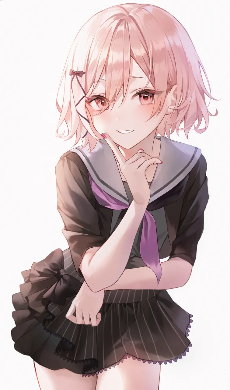 1otheralternate_hair_lengthalternate_hairstyleblack_serafukublushbob_cutfinger_to_cheekhair_ornamenthaircliplooking_at_viewerneckerchiefother_focuspink_eyespink_hairpink_nailspurple_neckerchiefsailor_collarschool_uniformserafukushort_hairshort_sleevessimple_backgroundsolowhite_backgroundwhite_sailor_collar