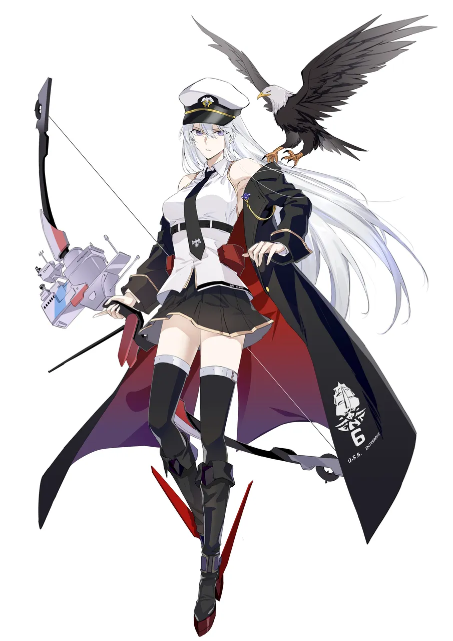 1girlbare_shouldersbeltbirdblack_beltblack_bootsblack_coatblack_necktieblack_thighhighsbootsbow_(weapon)breastscoatcollared_shirteaglefull_bodyhatholdingholding_weaponknee_bootslong_coatlong_hairlooking_at_viewermilitarymilitary_hatminiskirtnecktieoff_shoulderopen_clothesopen_coatpeaked_cappurple_eyesrudder_footwearshirtskirtsleevelesssleeveless_shirtsolothighhighsthighhighs_under_bootsweaponwhite_backgroundwhite_hairwhite_hat