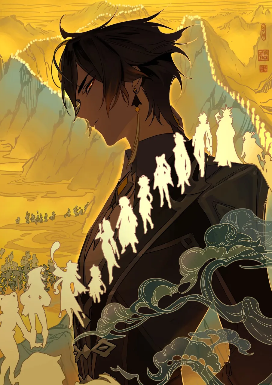 4boys6+girlsarms_behind_backbrown_coatbrown_hairchinese_clothesclosed_mouthcloudcoatearringsexpressionlessjewelrylooking_at_viewermale_focusmountainmountainous_horizonmultiple_boysmultiple_girlsnecktieorange_eyessilhouettesingle_earringsolo_focussymbolismtasseltassel_earringswhite_necktieyellow_theme