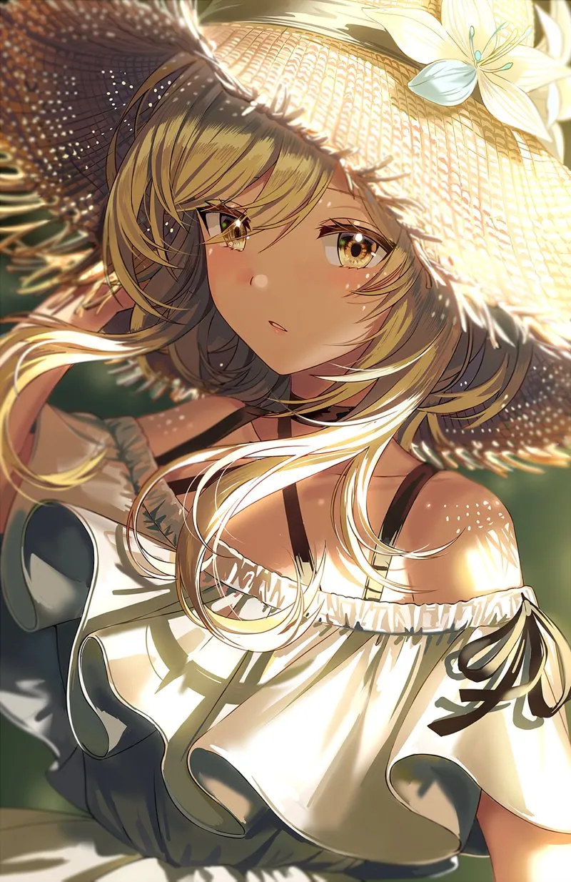 1girlalternate_costumearm_upbare_shouldersblack_chokerblonde_hairblurryblurry_backgroundblushchokerclose-upcollarbonecriss-cross_halterdresseyes_visible_through_hairfloating_hairflowerfrilled_dressfrillshair_between_eyeshair_over_one_eyehalterneckhand_on_headwearhathat_flowerlooking_at_vieweroff-shoulder_dressoff_shoulderparted_lipsshadeshort_hair_with_long_lockssidelockssolostraw_hatsun_hatupper_bodywhite_dresswhite_floweryellow_eyes