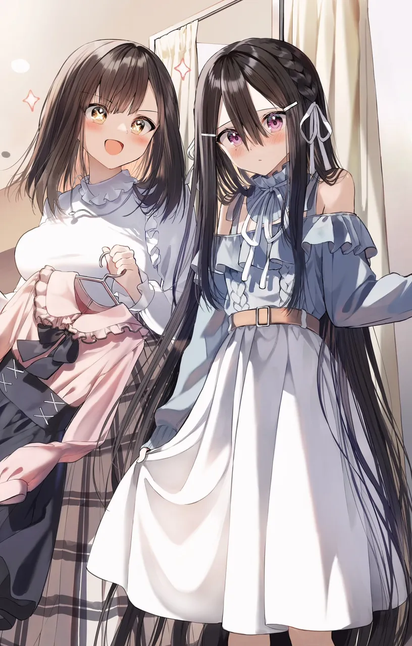 1boy1girl:dabsurdly_long_hairbare_shouldersbeltblack_hairblushbraidbreastsbrown_eyesbrown_hairclothes_hangercrossdressingcurtainsfrench_braidhair_between_eyeshair_ornamenthair_ribbonhaircliphigh-waist_skirtholdingholding_clothes_hangerindoorsjewelrylarge_breastslong_hairlong_sleeveslooking_at_viewermedium_hairmolemole_under_eyenecklaceopen_mouthpink_eyesplaid_clothesplaid_skirtribbonskirtskirt_holdsmilesparklesparkling_eyestrapvery_long_hairwhite_ribbonwhite_skirt