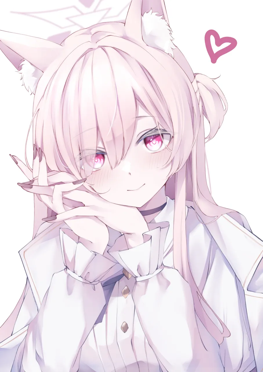 1girlanimal_ear_fluffanimal_earsblack_chokerblack_nailsblushchokerclosed_moutheyes_visible_through_hairfingernailshair_between_eyeshaloheartlong_hairlong_sleevesnail_polishpink_eyespink_hairshirtsimple_backgroundsmilesoloupper_bodywhite_backgroundwhite_shirt
