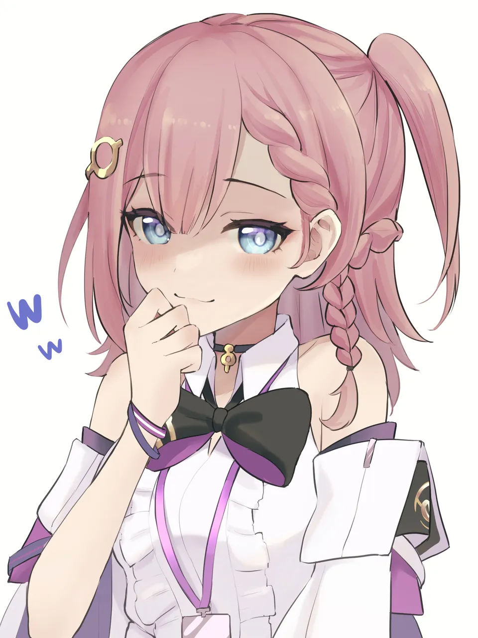 1girlblack_bowblue_eyesbowbraidbraided_bangsbrown_haircenter_frillsclosed_mouthcollared_shirtfrillshair_between_eyeshair_ornamenthand_to_own_mouthhand_uplong_hairlooking_at_viewerone_side_upshirtsimple_backgroundsleevelesssleeveless_shirtsmilesoloupper_bodywhite_backgroundwhite_shirt