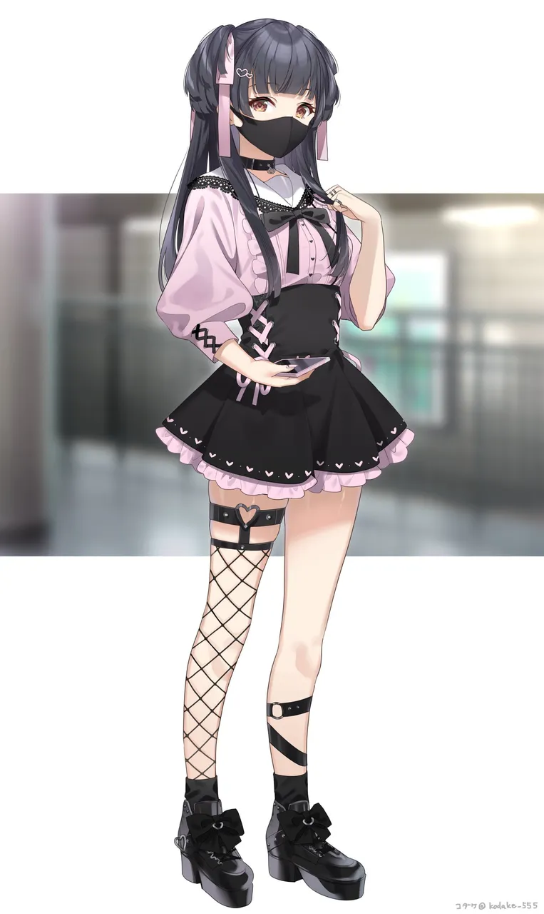 1girlblack_hairblack_maskblack_ribbonblack_shoesblack_skirtblunt_bangsblurryblurry_backgroundbrown_eyescellphonefishnetsfrillsfull_bodyhair_ornamenthair_ribbonheartheart_hair_ornamentheart_printhigh-waist_skirtholdingholding_phonejewelryjirai_keilong_hairlooking_at_viewermaskmouth_maskneck_ribbono-ringphonepink_ribbonpink_shirtplatform_shoespuffy_sleevesribbonringshirtshoessingle_thighhighskindentationskirtsmartphonesockssolostandingthighhighsthighstwitter_username