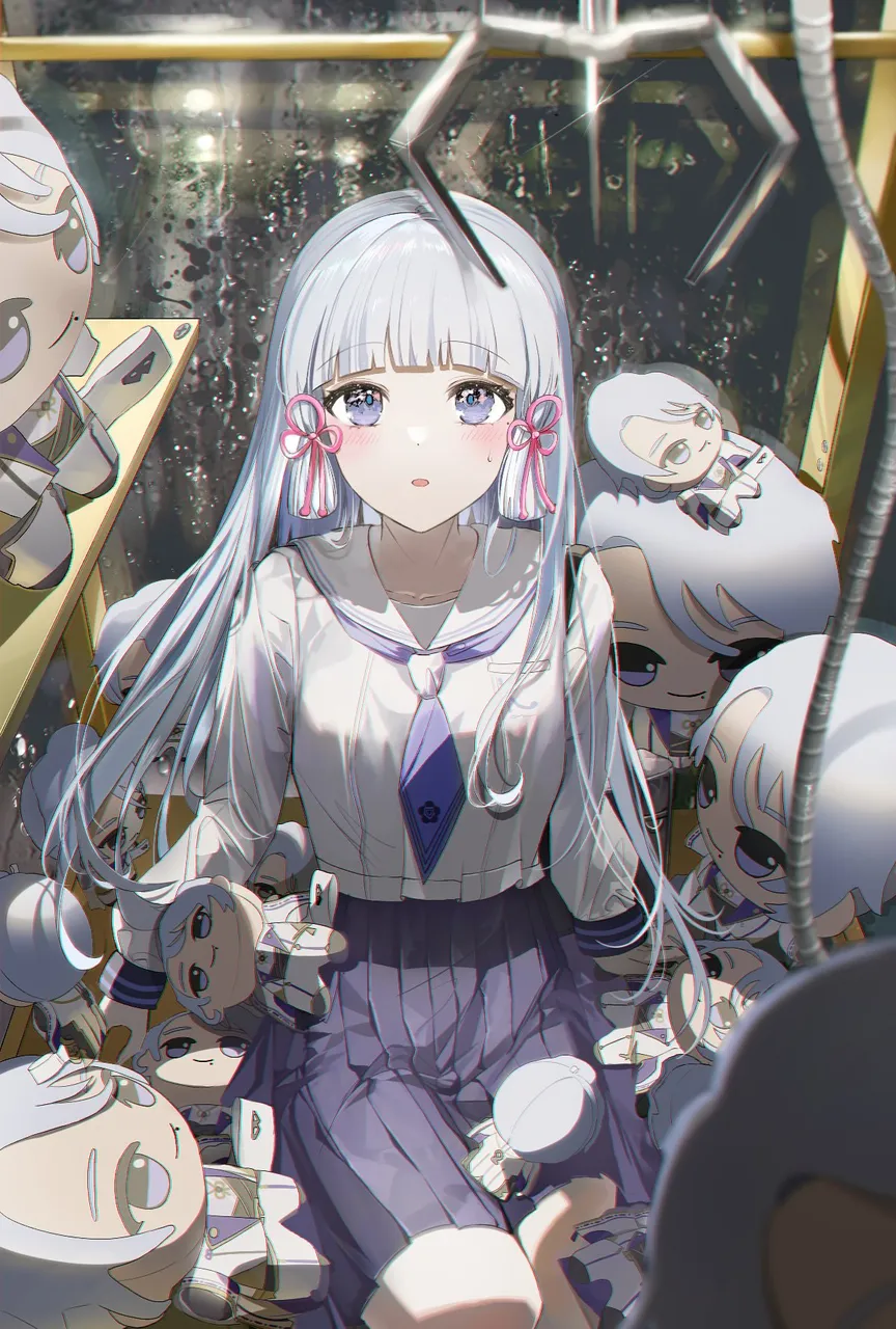 1girlblack_skirtblue_eyesblue_neckerchiefblunt_bangsblunt_tressesblushcharacter_dollchinese_knotcrane_gamedollfloral_printgrey_hairin_crane_gamelong_hairlong_sleeveslooking_at_viewerneckerchiefofficial_alternate_costumeparted_lipspleated_skirtsailor_collarshirtsittingskirtsolosweatdroptabletoo_many_dollswater_dropwhite_sailor_collarwhite_shirtwindow