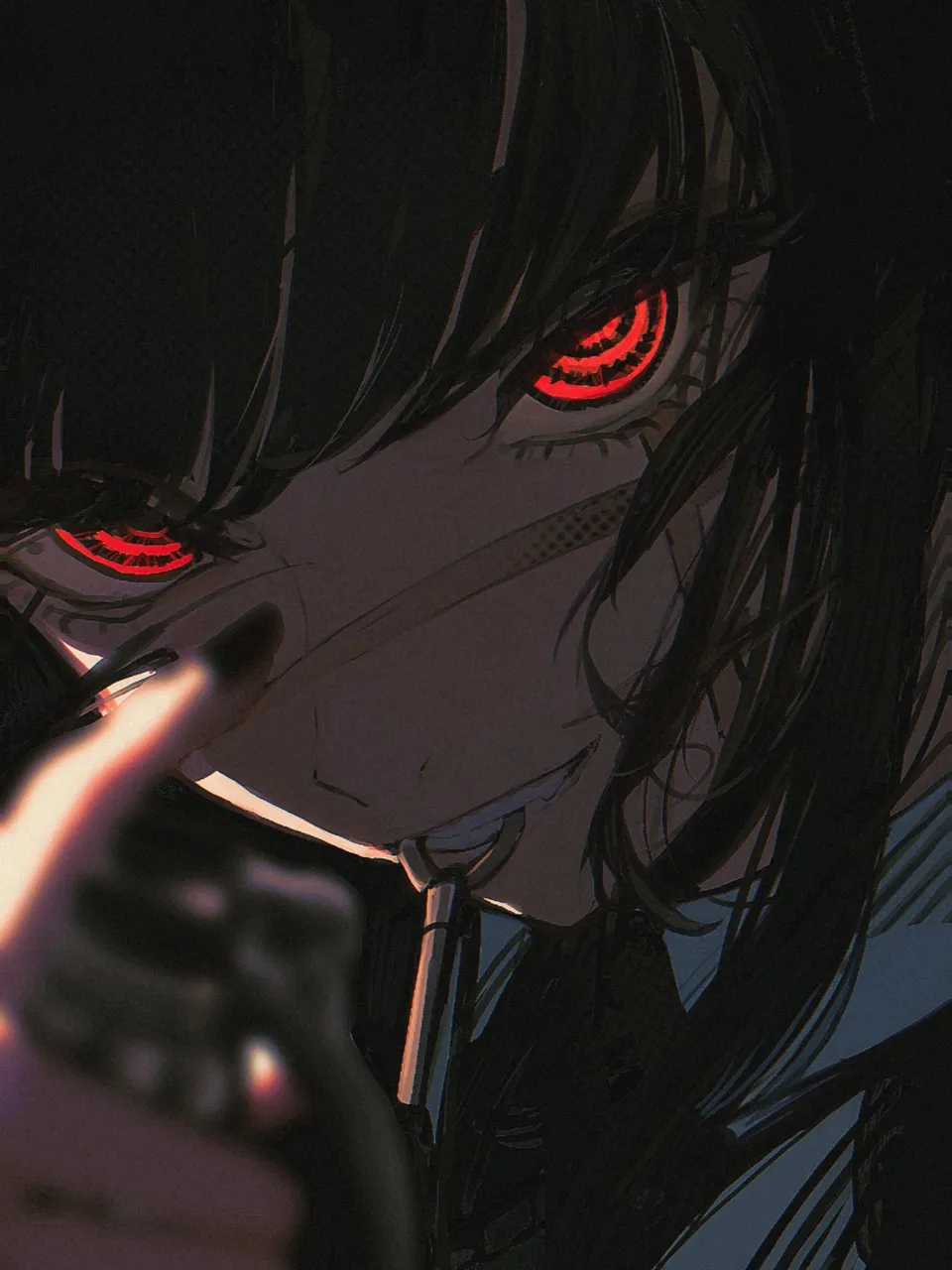 1girlblack_hairblurryblurry_foregroundcross_scardressexplosivefourth_east_high_school_uniformgrenadegrenade_pinholdingholding_grenadelong_hairlooking_at_viewerparted_lipspinafore_dressred_eyesringed_eyesscarscar_on_cheekscar_on_faceschool_uniformsleevelesssleeveless_dresssmilesolo