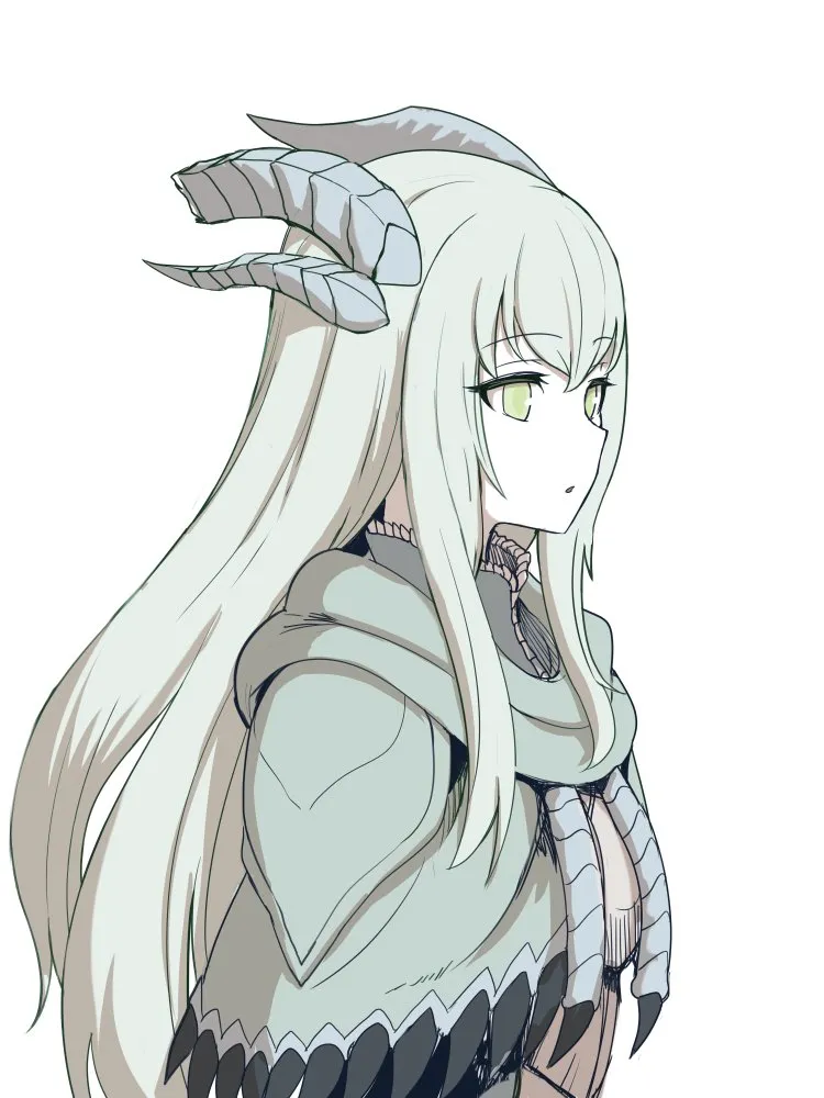 1girlarmorarmored_dressbroken_horndragon_girldragon_hornsdressfrom_sidegenderswapgenderswap_(mtf)green_eyeshornslong_hairmonster_girlparted_lipspersonificationsidelockssimple_backgroundsoloupper_bodywhite_backgroundwhite_hair