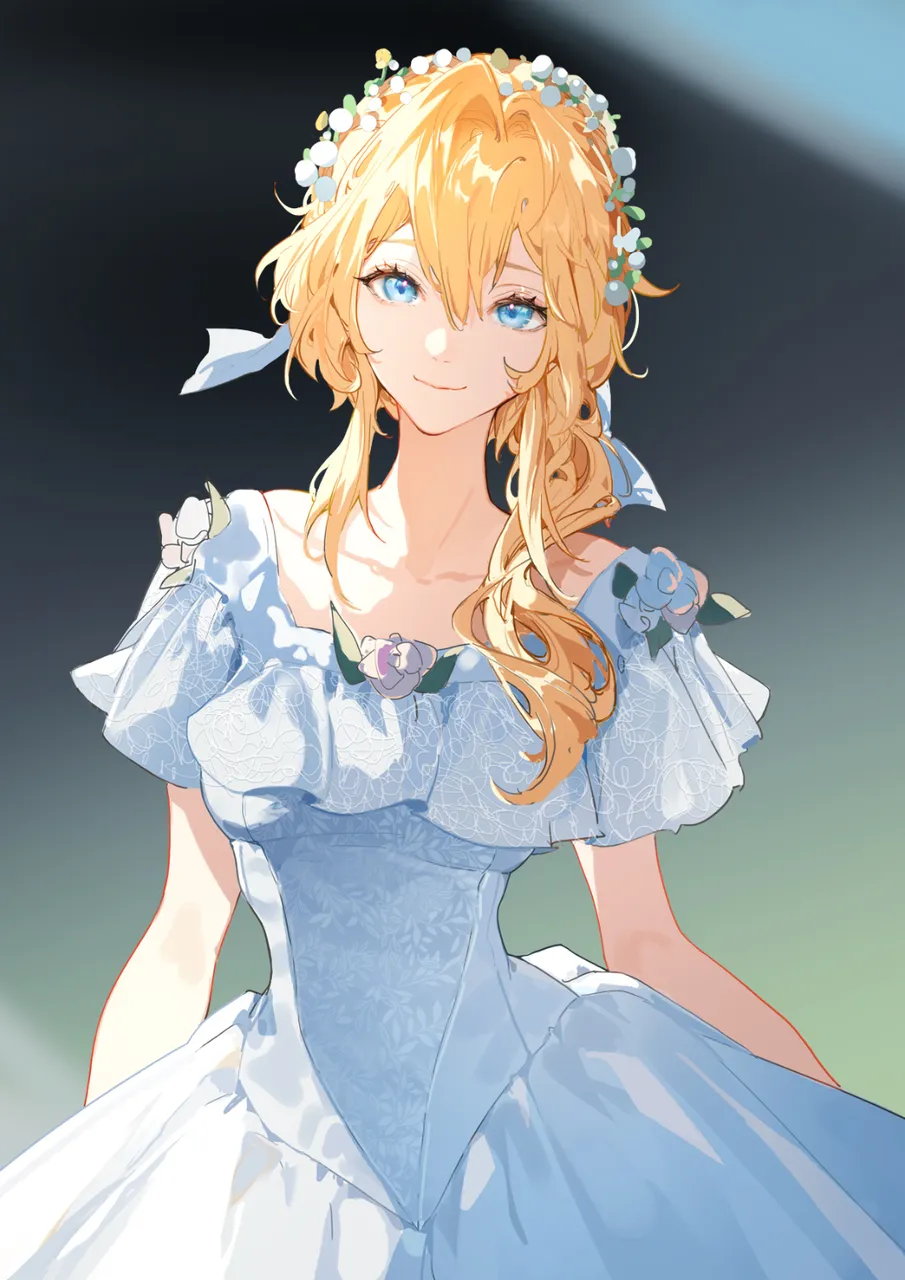 1girlalternate_hairstylearms_behind_backballerinablack_backgroundblonde_hairblue_dressblue_eyesclosed_mouthcollarbonedressflowergradient_backgroundhair_between_eyeshair_flowerhair_intakeshair_ornamenthair_over_shoulderhead_tiltleaf_printlight_smilelong_hairlooking_at_viewershort_sleevessimple_backgroundsmilesolosquare_necklinewavy_hairwhite_dresswhite_flower
