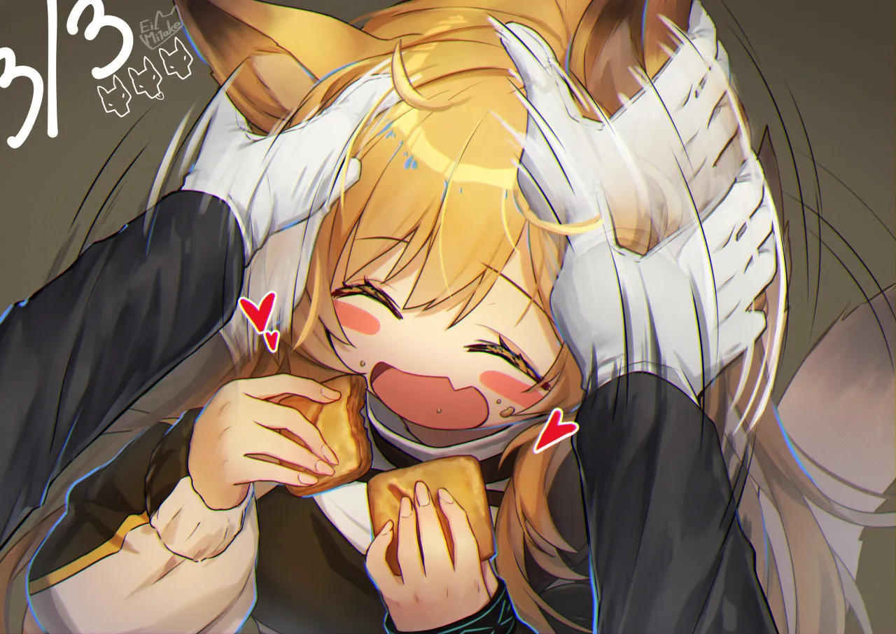 1girl1other:d^_^afterimageahogeambiguous_genderanimal_ear_fluffanimal_earsbaggy_clothesbiscuit_(bread)black_coatblack_dressblonde_hairblush_stickersclosed_eyescoatdateddog_earsdog_taildresseatingfangfoodglovesgrey_backgroundhair_between_eyesheadpatheartholdingholding_foodinfection_monitor_(arknights)jacketlong_hairlong_sleevesopen_mouthsidelockssignaturesimple_backgroundskin_fangsmilestandingtailupper_bodywhite_gloves