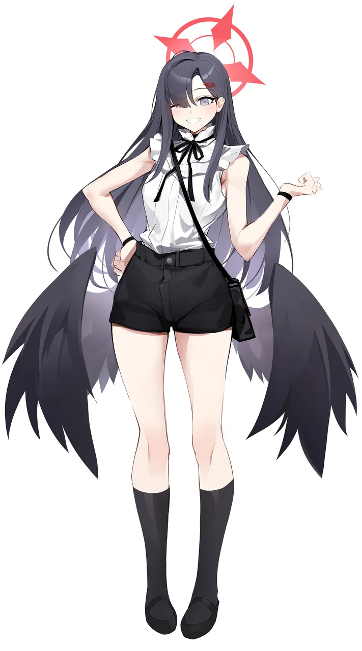 1girlbagblack_hairblack_shoesblack_shortsblack_socksblack_wingsblushfeathered_wingsfull_bodygrey_eyeshalolong_hairlow_wingsone_eye_closedopen_mouthred_haloshirtshoesshortsshoulder_bagsimple_backgroundsleevelesssleeveless_shirtsmilesockssolounusually_open_eyeswhite_backgroundwhite_shirtwings