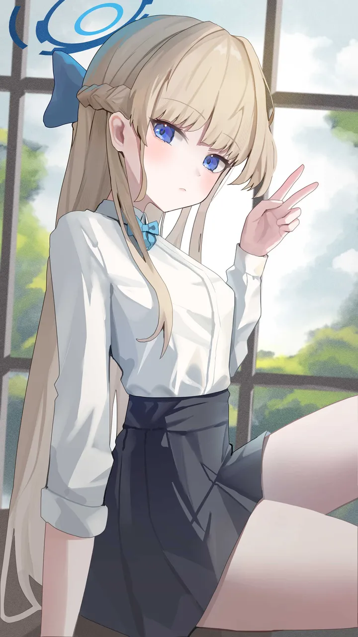 1girlblack_skirtblonde_hairblue_bowblue_bowtieblue_eyesblue_haloblushbowbowtiebraidclosed_mouthcowboy_shothalolong_hairlong_sleeveslooking_at_viewerpleated_skirtshirtsittingskirtsolovwhite_shirt