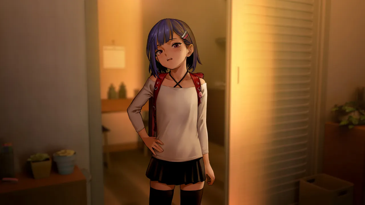 1girlbackpackbagbare_shouldersblack_skirtblack_thighhighsblue_hairblushcrime_prevention_buzzerflat_chesthair_ornamenthaircliphand_on_own_hipindoorslong_sleeveslooking_at_viewermolemole_under_eyeopen_mouthpink_eyespleated_skirtrandoserured_bagshirtshort_hairskirtsolostandingthighhighswhite_shirt