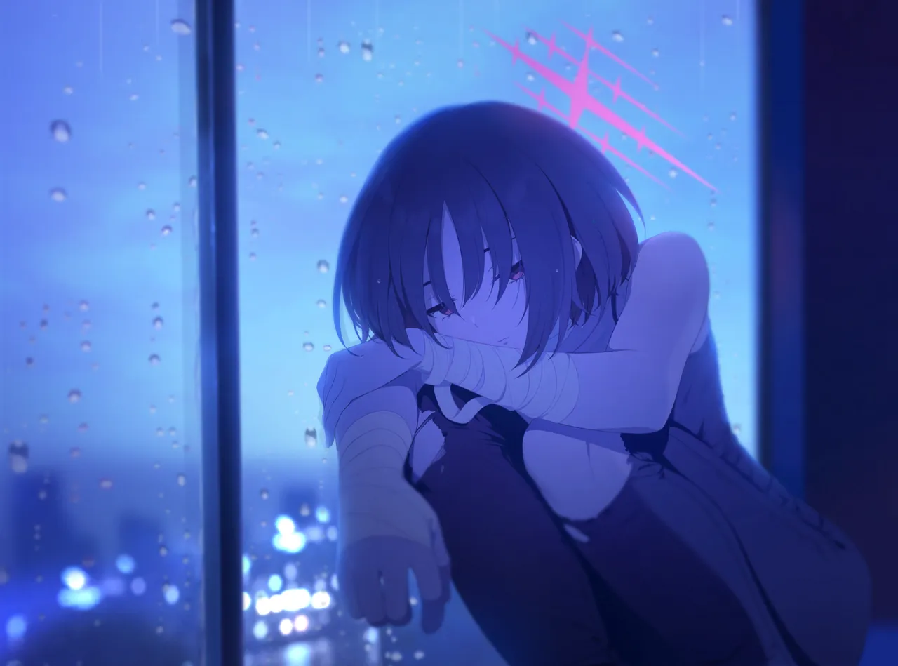 1girlbandaged_neckbandagesblurryblurry_backgroundblurry_foregroundbrown_haircamisolecheek_restcondensationdenimhalf-closed_eyeshaloindoorsjeansknees_to_chestlooking_at_viewermedium_hairpantsrainred_eyesred_halosolostar_halotorn_clothestorn_jeanstorn_pantswindowwrist_wrap